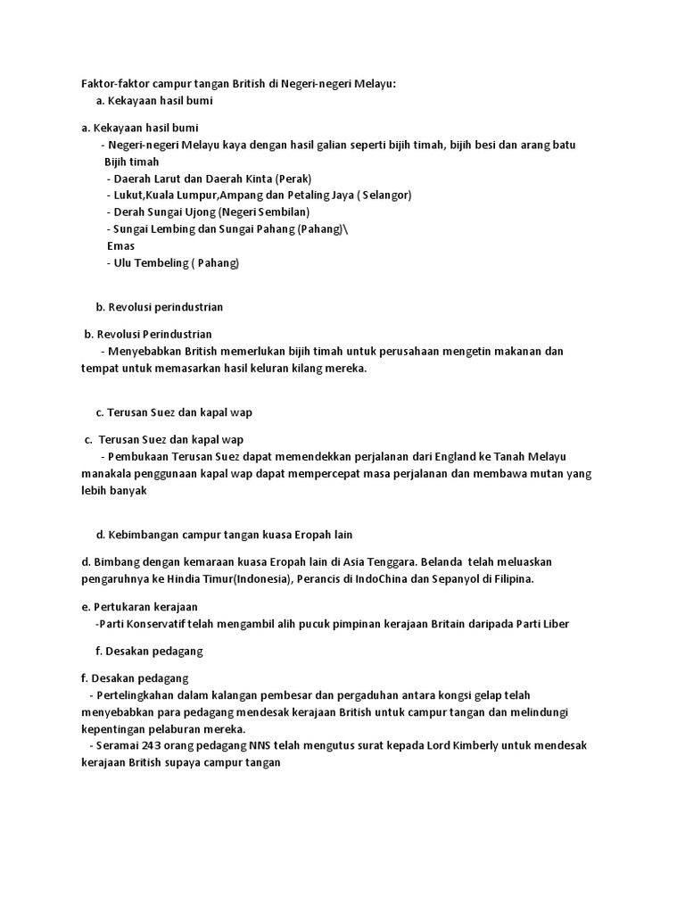 Campur Tangan British Di Tanah Melayu Docx Campur Tangan British Di Tanah Melayu Menjelang Tahun 1874 Dasar British Terhadap Negerinegerimelayu Course Hero from www.coursehero.com British ambil alih selangor dan melantik j.g davidson sebagai residen pertama. Campur tangan british di tanah melayu juga disebabkan oleh faktor politik. Latar belakang perluasan kuasa british di perak. Pada tahun 1859, raja abdul samad bin raja abdullah ibni almarhum sultan ibrahim shah, telah dilantik menjadi sultan selangor bergelar sultan abdul samad menggantikan ayah saudara baginda almarhum sultan muhammad shah yang telah mangkat pada tahun 1857. Bermula di perak kemudian di selangor, negeri sembilan dan pahang. Penglibatan british di johor bermula sejak kedatangan raffles dan pembukaan singapura pada tahun 1819. Akibatnya pedagang mendesak british campur tangan dan melindungi kepentingan pelaburan mereka di nnm. Sebuah kilang pembuatan sarung tangan getah di daerah ini diarahkan menutup operasi mulai hari ini hingga 29 mei ini.