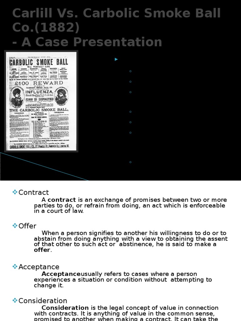 Carlill v carbolic smoke ball company 1892 ewca civ 1 is an english contract law decision by the court of appeal, which held an advertisement containing certain terms to get a reward constituted a binding unilateral offer that could be accepted by anyone who performed its terms. The carbolic smoke ball was a hollow rubber ball, 5 centimetres across, with a nozzle covered by gauze. Has been published under the terms of the creative commons attribution 3.0 (cc by 3.0) for guidance on citing carlill v. Banks pittman for the plaintiff. This entry about carlill v carbolic smoke ball company has been published under the terms of the creative commons attribution 3.0 (cc by 3.0) licence, which permits unrestricted use and reproduction.