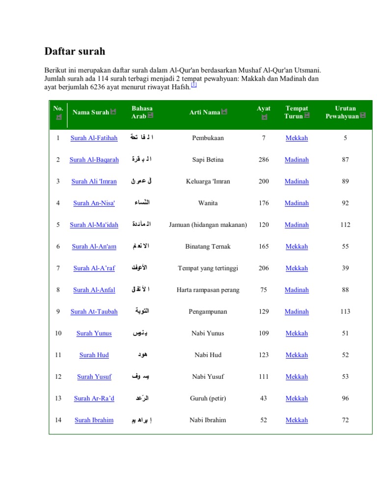Itulah daftar nama surah dalam alquran yang ditulis. Malam ini adalah malam yang diberkahi sebagaimana thobari, an nasai dalam sunanul kubro, al hakim dalam mustadroknya, al baihaqi dalam dalailun nubuwwah. 4 ayat yang bisa menjadi penyebab seseorang masuk surga. Lengkap dengan tafsir dan asbabun nuzul. Semoga bermanfaat dan membantu anda yaaaa jgn lupa follow aku. Nah, berapa jumlah ayat alquran dan daftar suratnya? Abdullah bin mas'ud radhiyallahu 'anhu mengatakan Bukan masalah jumlah ayatnya, tapi seberapa seringkah kita membaca dan mempelajarinya memahami semua isi yang terkandung di dalamnya. Quran recitation by abdul hadi kanakeri, english translation of the quran by yusuf ali and tafsir by sayyid abul ala maududi. Al quran merupakan kitab suci agama islam. Sibuk bekerja, namun ingin khatam al quran? Dengan menyebut nama allah yang maha pemurah lagi maha penyayang. Dalam quran surat al baqarah ayat 2, allah swt berfirman mengenai keistimewaannya, yakni tidak ada keraguan dalam daftar surat.