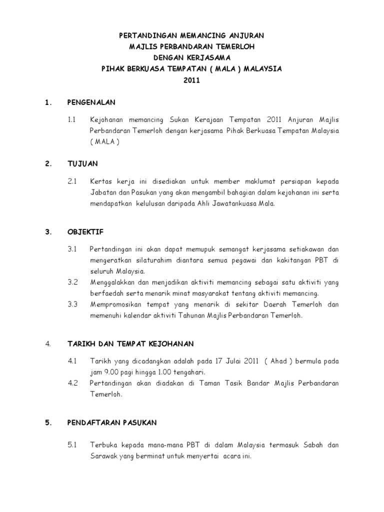 Related : Kertas Kerja Pertandingan Memancing - Pertandingan memancing anjuran majlis perbandaran temerloh dengan pihak berkuasa tempatan ( mala ) malaysia kertas kerja ini disediakan untuk member maklumat persiapan kepada jabatan dan pasukan..