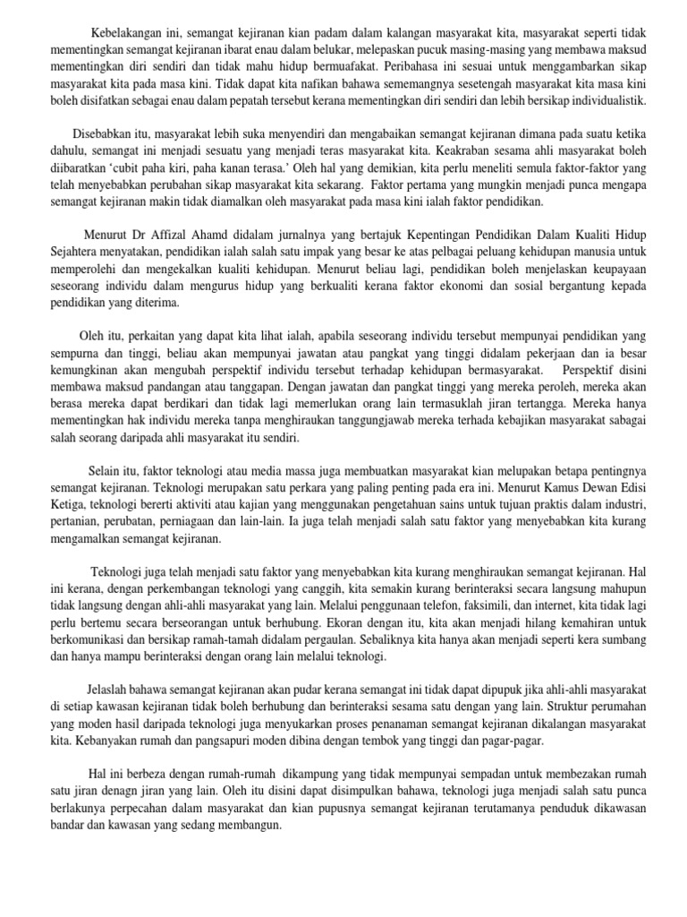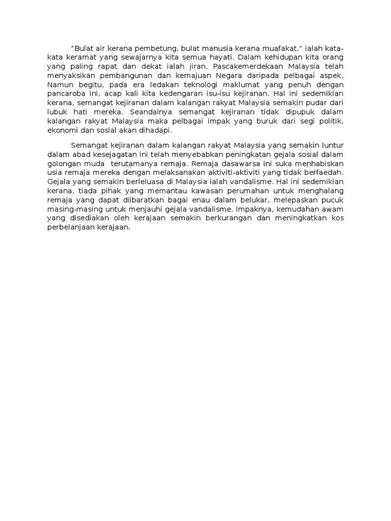 Contoh karangan spm memupuk semangat kejiranan dalam kalangan masyarakat. Semangat kejiranan merujuk aspek kesefahaman dan hubungan erat sesama jiran. 3.0 objektif objektif amalan semangat kejiranan penting dalam mengurangkan kadar jenayah setempat ialah : Kelunturan semangat kejiranan dalam kalangan masyarakat pada era globalisasi yang semakin canggih amat membimbangkan kerana bakal menjejaskan struktur sosial kehidupan bernegara. Membentuk sikap atau tingkah laku yang baik terhadap kejiranan setempat 2.