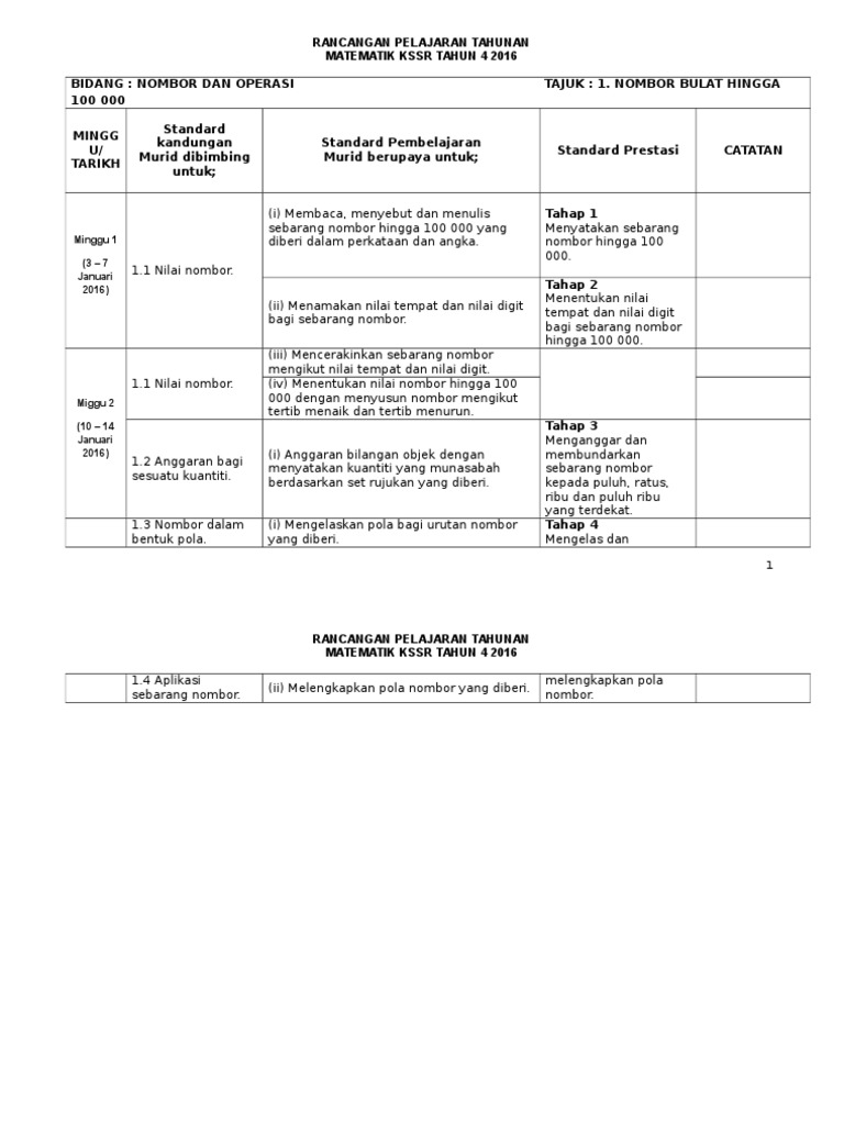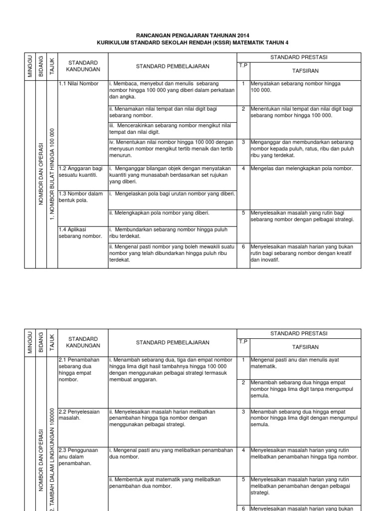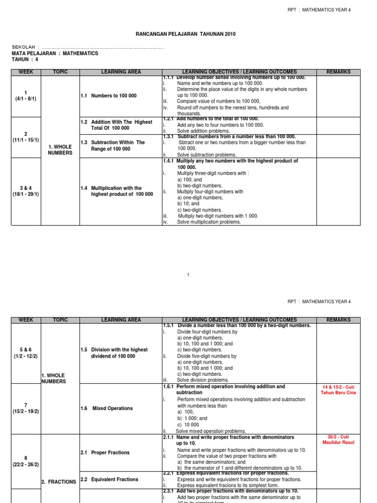 Copyright matematika kelas iv semester 2 revisi 2017. Rancangan pengajaran tahunan hendaklah disesuaikan dengan takwim persekolahan tahun semasa minggu & tarikh standard kandungan topik standard pembelajaran nombor bulat. Numbers to 100 000learning objectives. Saya akan berbagi rpp matematika kelas 4 kurikulum 2013 revisi 2017, kepada rekan guru sekalian. Rancangan pelajaran tahunan matematik kssr tahun 4.