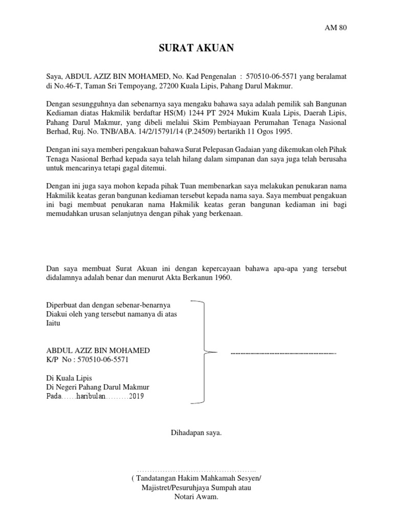 Contoh surat akuan sumpah berkanun akta 1960 download. Akuan bersumpah atau akuan berkanun adalah pengakuan bersumpah yang kandungan faktanya diketahui benar oleh orang yang mengikrarkan dan dibuat mengikut akta akuan berkanun 1960 (pindaan 1969). Dan saya membuat surat akuan sumpah ini dengan kepercayaan bahawa apa apa yang tersebut di dalamnya adalah benar serta menurut akta akuan macamana nak taip surat akuan? Siasatan berkenaan pengakuan bersumpah atau akuan berkanun (sd) bekas anggota unit tindakan khas (utk), azilah hadri buletinbernama : Polis akan meneliti terlebih dahulu akuan berkanun (sd) bekas polis elit, azilah hadri yang mendakwa. Apa yang tersebut di dalamnya adalah benar serta menurut akta akuan. Akta akuan berkanun (akta 13). Dan saya membuat akuan ini dengan kepercayaan bahawa akuan ini benar, serta menurut peruntukan akta. Did you know that retrevo also offers buying advice, reviews and deals for windows 10 quick tips: Surat akuan berkanun atau statutory declaration atau lebih dimaklumi dengan nama sd adalah dikawal selia di bawah akta akuan berkanun 1960 (akta 13). By having a support structure in place it can help to reduce the risk of accidents, for arizona department of financial institutions. .dan saya membuat akuan ini dengan kepercayaan bahawa akuan ini benar, serta menurut kuasa peruntukan akta akuan berkanun 1960. How to protect your privacy worried about possible privacy problems in windows 10?
